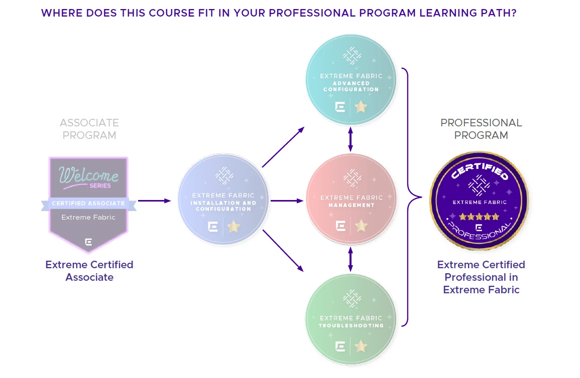 Upon completion of this course, students will have tested their theoretical and practical knowledge, and skills on all aspects of the four Extreme Fabric knowledge credential classes. On passing this assessment students will become an Extreme Certified Professional in Extreme Fabric.